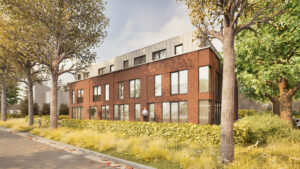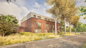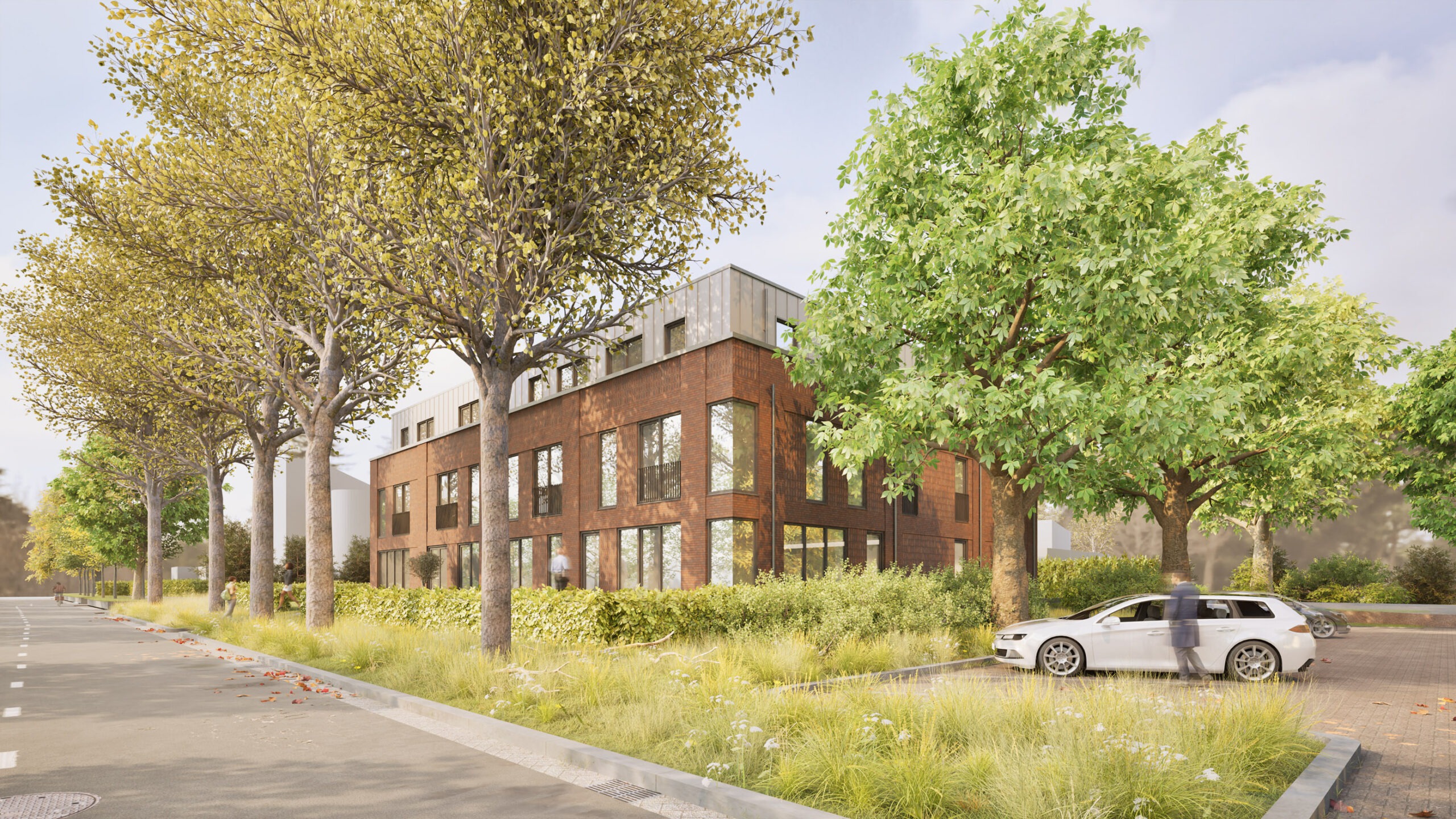 Tussen de karakteristieke bomen verrijst een woonzorgcomplex met 16 wooneenheden.